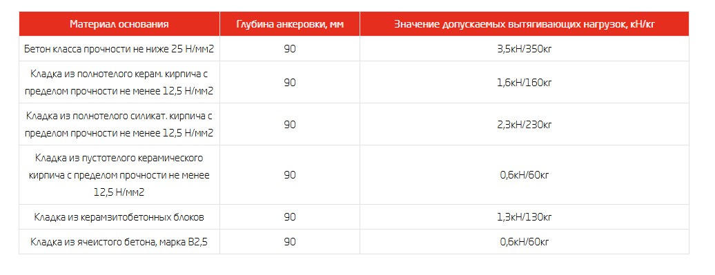 Материал применения: бетон, полнотелый кирпич, пустотелый кирпич, керамзитобетон, газобетон.