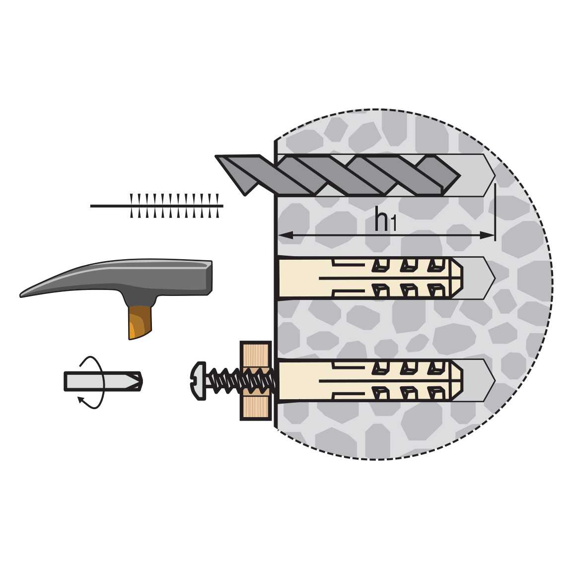 Дюбели PND L - дюбели из полиамида с удлиненной распорной зоной для крепления в бетоне, кирпиче, природном камне и пористых основаниях (вспененный бетон, керамзитобетон) Преимущества:- простота монтажа;- стопорные крылья предотвращают прокручивание дюбеля в отверстии в момент установки;- надежное сцепление с базовым материалом, благодаря фиксирующим блокам на теле дюбеля;- геометрия внутреннего профиля центрирует шуруп при установке, обеспечивая равномерное раскрытие дюбеля Применение:- предметы домашнего интерьера- коммуникации- легкие и средние конструкции Дюбель рекомендуется использовать с универсальным шурупом.min. длина шурупа = длина дюбеля + толщина прикрепляемого материала