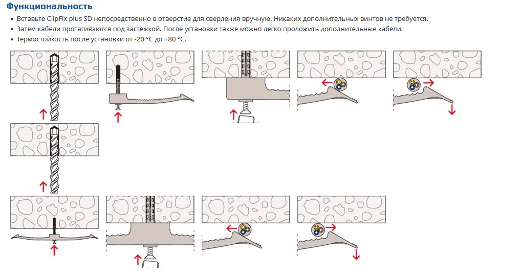Основные характеристики • Компактное крепление кабеля благодаря плоской конструкции. • Возможна простая модернизация. • Надежная направляющая благодаря зажиму. • Простая установка одной рукой. • Изготовлена из высококачественного нейлона. Преимущества • Плоская конструкция кабельной застежки KB обеспечивает компактное крепление кабеля и упрощает последующую прокладку кабеля. • Кабельная застежка SF plus KB с фиксатором ClipFix позволяет производить монтаж одной рукой, что обеспечивает гибкую и экономичную установку. • Прочный нейлоновый материал не содержит галогенов и силикона. Ее можно использовать круглый год, в том числе в мороз. Это обеспечивает высокий уровень безопасности. Применение • Несколько отдельных кабелей в небольшом монтажном пространстве • Несколько одиночных кабелей в подвесных потолках Строительные материалы Для крепления в: • Бетон • Твердый блок из пемзы • Твердый песчано-известковый кирпич • Натуральный камень с плотной структурой • Массивный кирпич