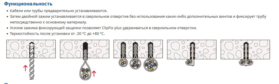 Лучшие функции • Экономит время монтажа: комбинированный анкер, винт и зажим. • Установка одной рукой упрощает монтаж над головой. • Высокая сила удержания благодаря фиксирующей защелке. • Компактная установка благодаря тонкой геометрии. • Изготовлен из высококачественного нейлона. Преимущества • Закрепить две трубы или трубопроводы можно только одним зажимом. • Полный элемент сочетает в себе анкер, винт и зажим. Это экономит материалы, позволяет производить монтаж одной рукой и сокращает время сборки. • Тонкая геометрия крепежного элемента лишь слегка выступает вперед, что позволяет экономить место. • Долговечный нейлоновый материал огнестойкий, не содержит галогенов и силикона, его можно использовать круглый год, в том числе в мороз. Это обеспечивает высокий уровень безопасности. Применение Для фиксации: • Отдельные электрические кабели • Кабельные жгуты • Гибкие трубы • Жесткие пластиковые трубы Строительные материалы • Бетон • Твердый пемзовый блок • Твердый силикатный кирпич • Натуральный камень с плотной структурой • Массивный кирпич