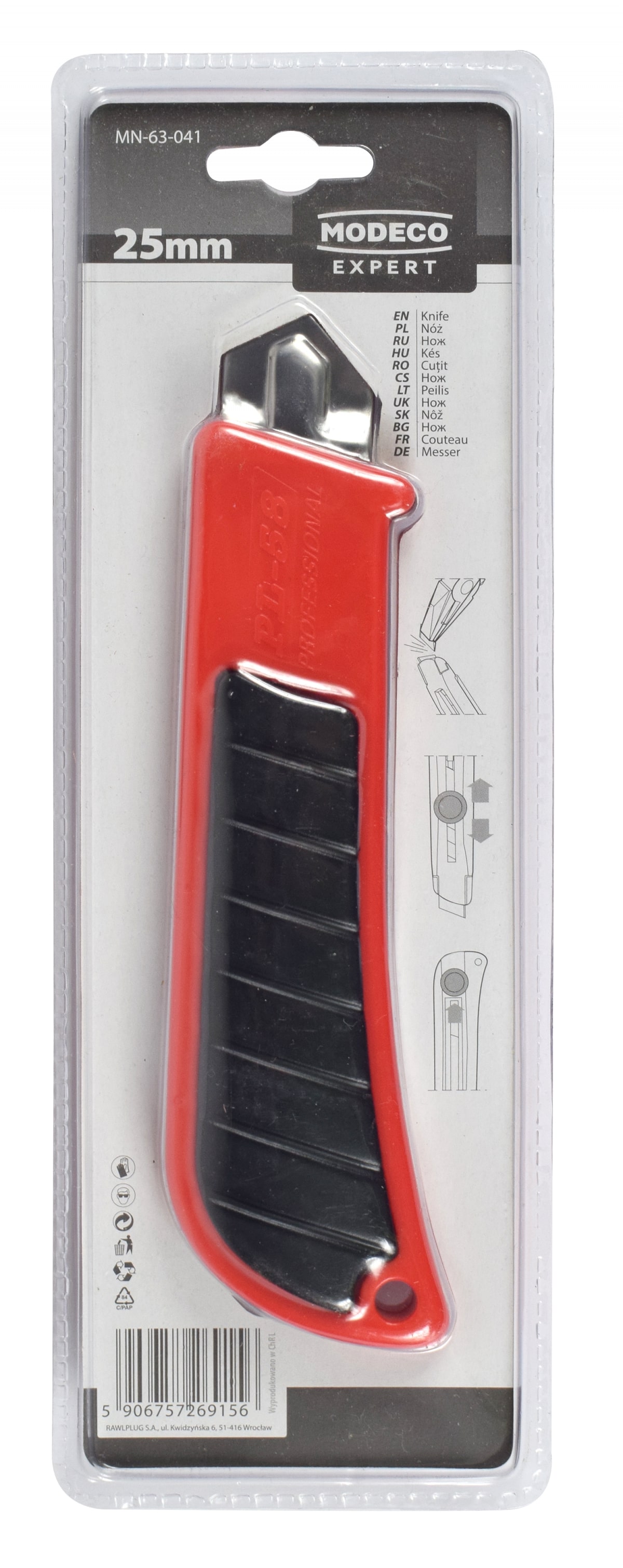Корпус из АБС-пластика обеспечивает малый вес и устойчивость к влаге Широкий клинок 25 мм обеспечивает быструю и точную резку гипсокартона Стальная направляющая обеспечивает жесткость лезвия при резке Замок от винтового лезвия обеспечивает точность резки и предотвращает втягивание лезвия во время работы